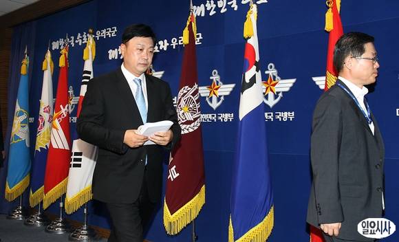 백윤형 방위사업청 대변인이 24일 오후 서울 용산구 국방부 브리핑실에서 차기전투기 선정을 위한 방위사업추진위원회 회의 결과에 대해 브리핑을 마친 뒤 퇴장하고 있다. 방위사업청은 이날 김관진 국방부 장관 주재로 열린 방추위 회의에서 차기전투기 사업에 단독 후보로 오른 미국 보잉의 F-15SE에 대한 선정안을 심의해 부결했다.