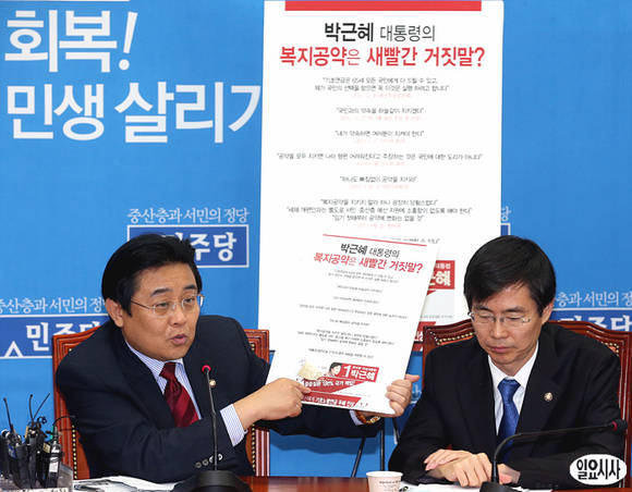 25일 오전, 국회 민주당 원내대표실에 꾸려진 24시간 비상국회 운영본부에 전병헌 원내대표(사진 왼쪽)가 "박근혜 대통령의 복지공약은 새빨간 거짓말"이라고 주장하고 있다.