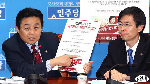 25일 오전, 국회 민주당 원내대표실에 꾸려진 24시간 비상국회 운영본부 1차 회의에서 전병헌 원내대표(사진 왼쪽)가 박근혜 대통령의 복지 공약에 대해 언급하고 있다.