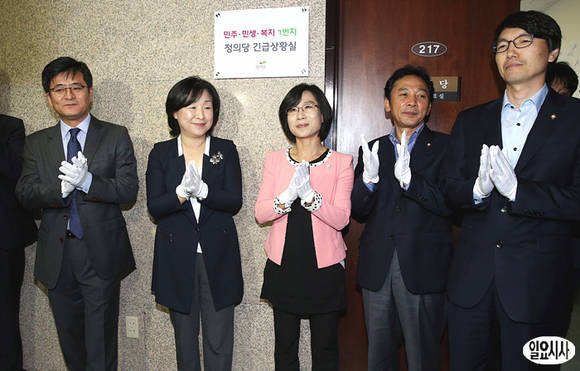 25일 오전, 국회 정의당 원내대표실에 꾸려진 긴급상황실 현판식에 심상정 원내대표(사진 왼쪽에서 두 번째) , 정진후 의원(사진 오른쪽에서 두 번째) 등이 참석한 가운데 박수를 치고 있다.