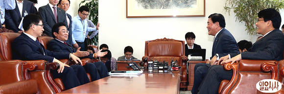 민주당 전병헌 원내대표-정성호 원내수석대표(사진 왼쪽)와 새누리당 최경환 원내대표-윤상현 원내수석부대표가 서울 여의도 국회 운영위원장실에서 만나 정기국회 등을 협의하고 있다.
