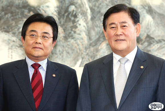 민주당 전병헌 원내대표(사진 왼쪽)와 새누리당 최경환 원내대표가 서울 여의도 국회 운영위원장실에서 만나 정기국회 등에 대해 협의하기 직전 취재진에 포즈를 취하고 있다.