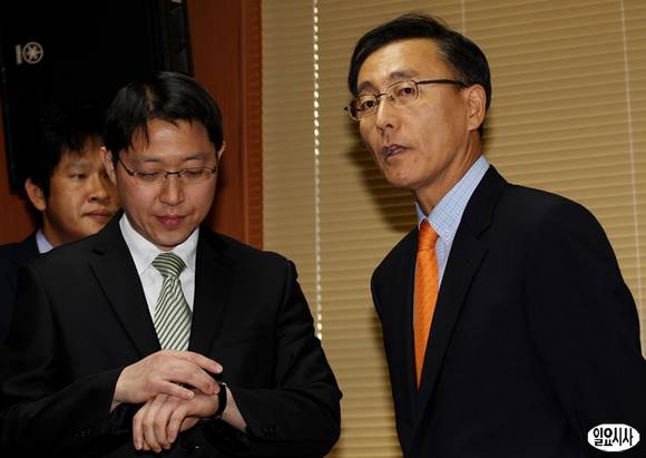 김수남 수원지검 검사장(오른쪽)이 26일 오후 경기도 수원시 영통구 수원지검 대회실에서 이석기 통합진보당 의원의 내란음모 사건에 대한 중간수사 결과 발표에 앞서 관계자와 이야기를 나누고 있다.