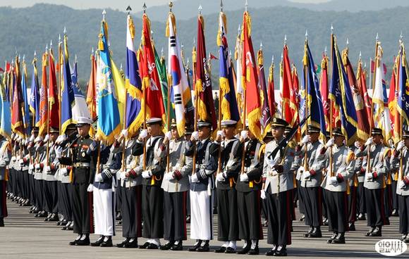 27일 오전 경기도 성남 서울공항에서 열린 건군 제65주년 국군의 날 기념행사 리허설에서 의장대원들이 사열을 하고 있다.