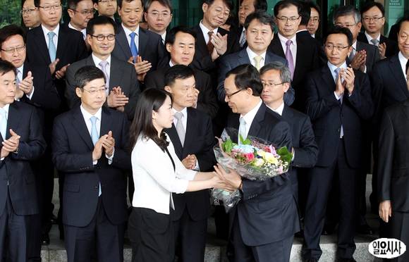 채동욱 검찰총장이 30일 오전 서울 서초동 대검찰청에서 열린 퇴임식을 마친 뒤 직원에게 꽃다발을 받고 있다.