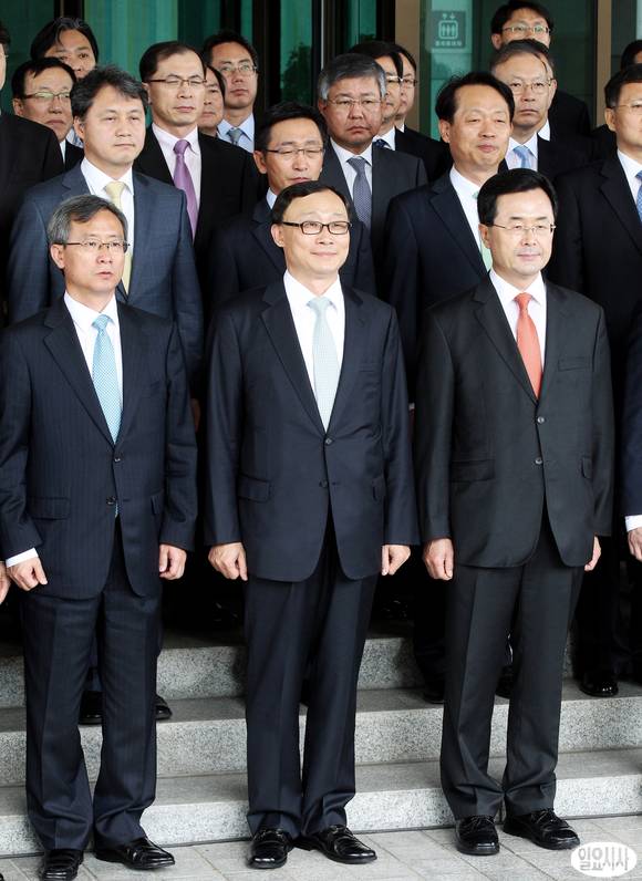 채동욱 검찰총장(앞줄 가운데)이 30일 오전 서울 서초동 대검찰청에서 열린 퇴임식을 마친 뒤 직원들과 기념촬영을 하고 있다.
