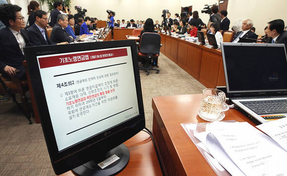 이영찬 보건복지부 차관이 참석한 가운데, 국회에서 열린 보건복지위 전체회의에 출석해 기초연금법과 관련해 회의가 진행되고 있는 가운데, 차관 석의 모니터에 기초노령연금법이 디스플레이 돼 있다.