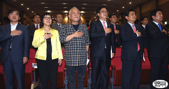 김한길 민주당 대표(왼쪽), 전병헌 원내대표 등이 30일 국회에서 열린 을지로위원회 출판기념회 및 입법결의대회 직전, 국기에 대한 경례를 하고 있다.