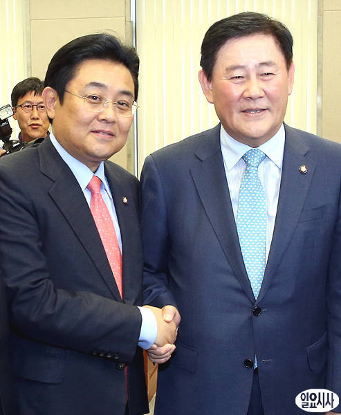30일 오후, 새누리당 최경환(사진 오른쪽)·민주당 전병헌 원내대가 국회 운영위원실에서 열린 운영위 전체회의 직전 악수를 나누고 있다.