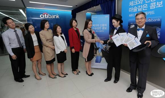 하영구 한국씨티은행장이 30일 서울 명동 씨티은행 중앙지점에서 체크카드에 본인의 최대 신용한도 내에서 신용결제까지 가능한 하이브리드 카드인 '씨티 체크+신용카드'를 선보이고 있다.