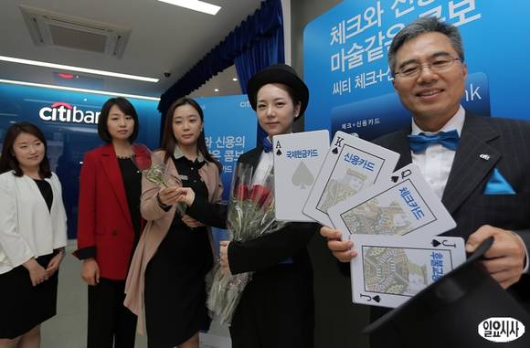 하영구 한국씨티은행장이 30일 서울 명동 씨티은행 중앙지점에서 체크카드에 본인의 최대 신용한도 내에서 신용결제까지 가능한 하이브리드 카드인 '씨티 체크+신용카드'를 선보이고 있다.