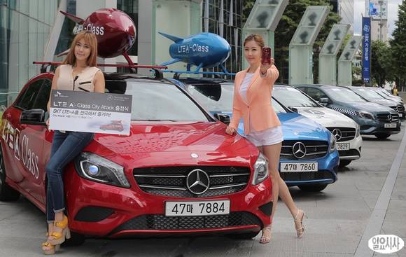 SK 텔레콤과 메르세데스 벤츠 코리아가 30일 서울 중구 을지로 SK텔레콤 본사 앞에서 'LTE-A'를 체험할수 있는 벤츠 A-Class기종을 전시, 서울을 누비는 체험 행사 진행을 위한 출정식을 갖고 있다.
