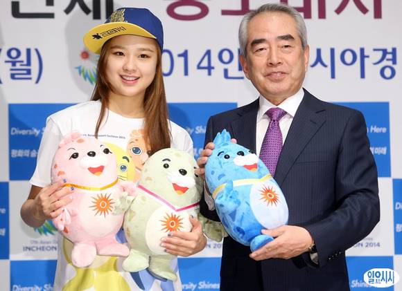 리듬체조 요정 손연재가 30일 서울 중구 프레스센터에서 열린 2014 인천아시아경기대회 홍보대사 위촉식에서 김영수 조직위원장으로부터 마스코트 인형을 전달받고 기념촬영을 하고 있다.