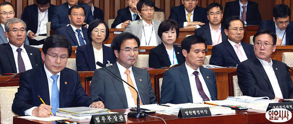 황교안 법무장관(왼쪽부터), 차한성 법원행정처장, 이성보 국민권익위원장, 이경옥 안정행정부 제2차관이 30일 오후 열린 국회 사법제도개혁특위에 출석해 있다.