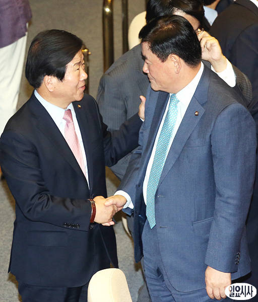 최경환 새누리당 원내대표가 30일 오후 국회 본회의장에서 본회의 직후, 박병석 국회부의장과 악수를 나누고 있다.
