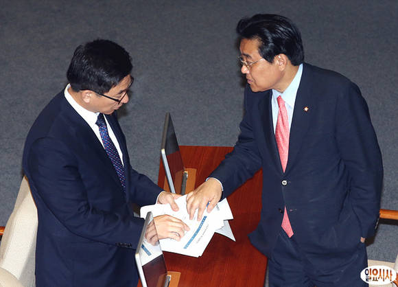 전병헌 민주당 원내대표와 정성호 원내수석부대표가 30일 오후 국회 본회의장에서 이야기를 나누고 있다.