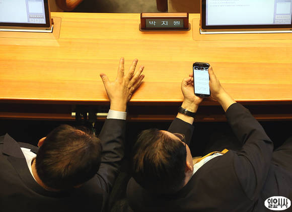 30일 오후 국회 본회의가 열린 가운데 민주당 박지원 의원이 스마트폰을 확인하고 있다.