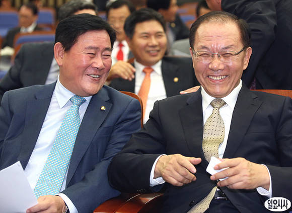 새누리당 황우여 대표와 최경환 원내대표(사진 오른쪽)가 30일 오후, 국회에서 열린 의원총회에서 대화 도중 활짝 웃고 있다.