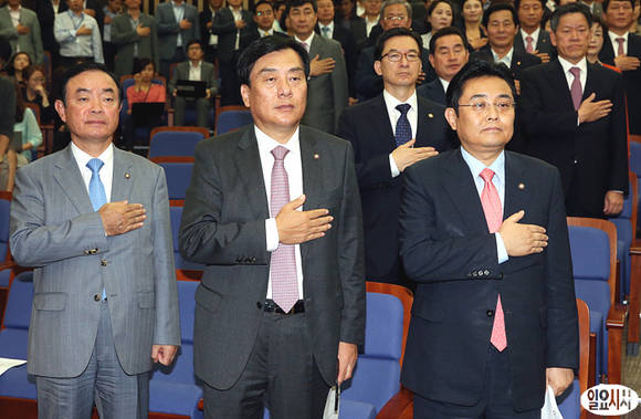 민주당 전병헌 원내대표, 박기춘 사무총장, 장병완 정책위의장 등이 30일 오전, 국회에서 열린 의원총회 직전국민의례를 하고 있다.