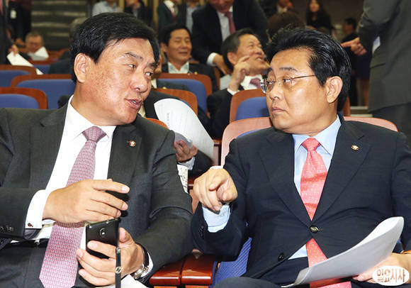 민주당 전병헌 원내대표(사진 오른쪽)가 30일 오전, 국회에서 열린 의원총회 도중 박기춘 사무총장과 대화하고 있다.