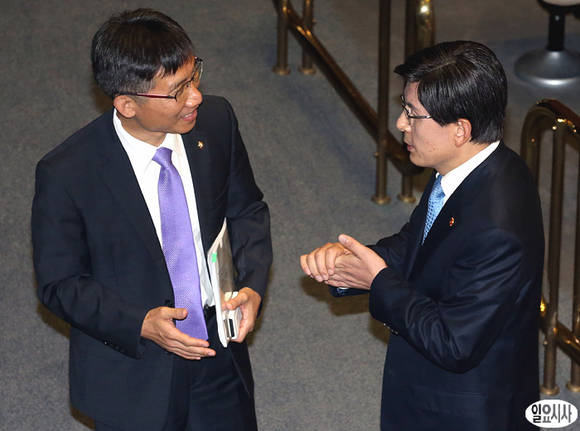 1일, 국회 본회의장에서 국회 긴급현안 질의 직후, 진보통합당 이상규 의원과 황교안 법무부장관이 대화를 나누고 있다.