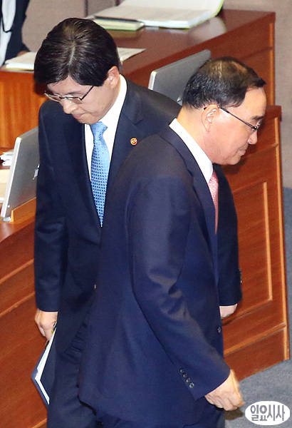1일, 국회 본회의장에서 국회 긴급현안 질의가 진행되고 있는 가운데, 정홍원 국무총리가 의원들의 질의를 마친 후 황교안 법무부장관 옆을 지나고 있다.