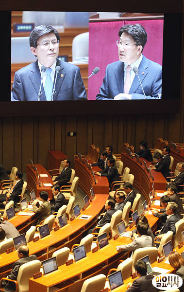 1일, 국회 본회의장에서 국회 긴급현안 질의가 진행되고 있는 가운데, 황교안 법무부장관이 새누리당 권성동 의원질의에 답변하고 있다.