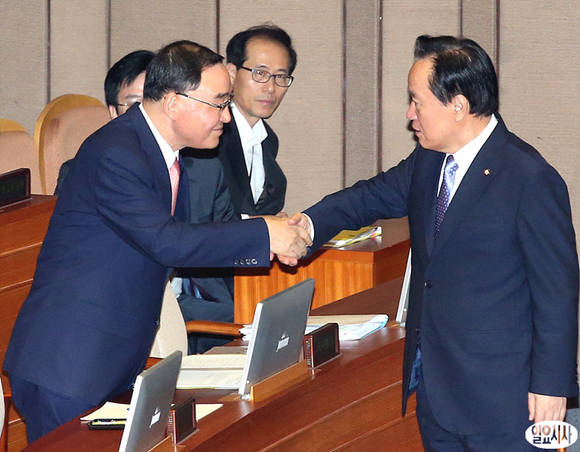 1일, 국회 본회의장에서 국회 긴급현안 질의 직후, 이병석 국회부의장과 정홍원 국무총리가 악수하고 있다.