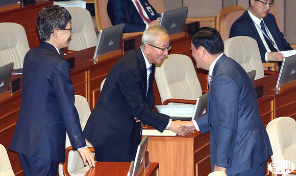 1일, 국회 본회의장에서 국회 긴급현안 질의 직후, 새누리당 최경환 원내대표와 현오석 경제부총리가 악수하고 있다.