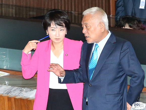 1일, 국회 본회의장에서 국회 긴급현안 질의 직후, 민주당 김한길 대표와 이언주 원내대변인이 심각한 표정으로 대화하고 있다.
