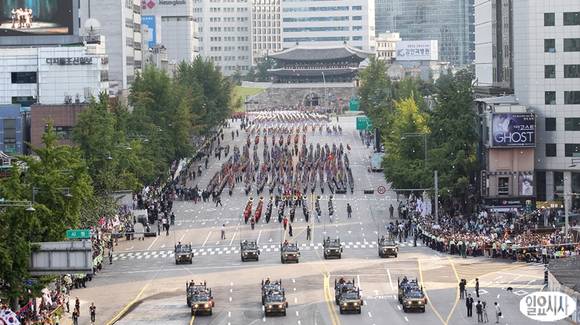 건군 제65주년 국군의 날을 맞아 1일 오후 서울 중구 숭례문에서 출발한 장병들이 광화문 방향으로 시가행진을 하고 있다.