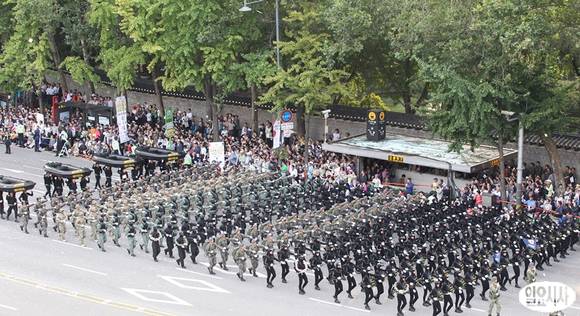 건군 제65주년 국군의 날을 맞아 1일 오후 서울 중구 숭례문에서 출발한 장병들이 광화문 방향으로 시가행진을 하고 있다.