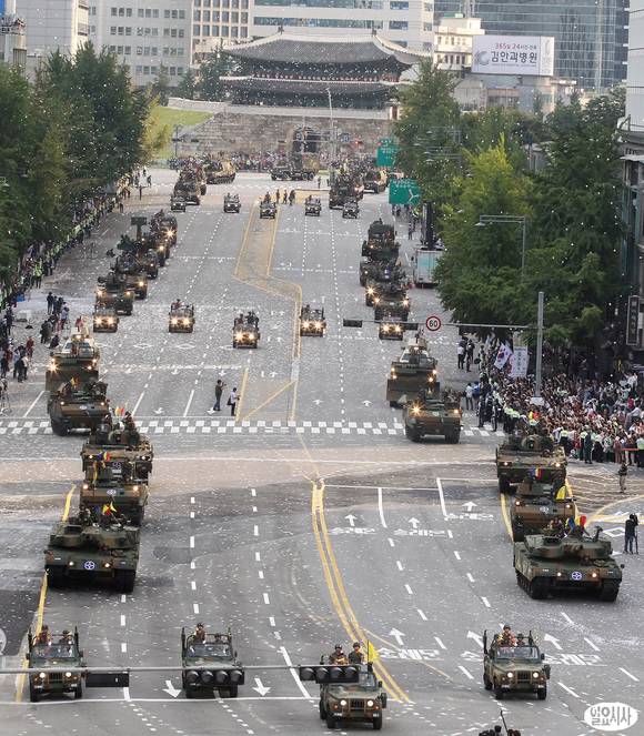 건군 제65주년 국군의 날을 맞아 1일 오후 서울 중구 숭례문에서 출발한 기계화 부대 장병들이 광화문 방향으로 시가행진을 하고 있다.