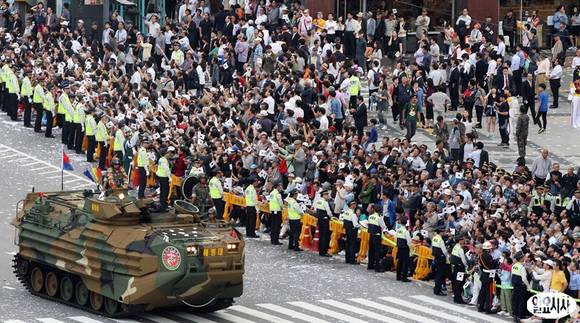 건군 제65주년 국군의 날을 맞아 1일 오후 서울 중구 숭례문에서 출발한 장병들이 광화문 방향으로 시가행진을 하고 있다.