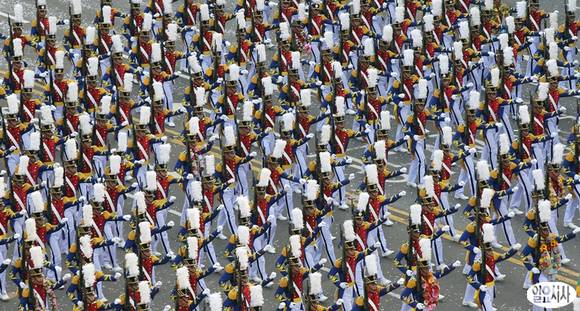 건군 제65주년 국군의 날을 맞아 1일 오후 서울 중구 숭례문에서 출발한 사관생도들이 광화문 방향으로 시가행진을 하고 있다.