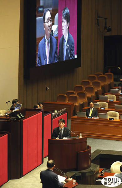 1일, 국회 본회의장에서 국회 긴급현안 질의가 진행되고 있는 가운데, 무소속 안철수 ?원이 정홍원 국무총리에게 질의하고 있다.