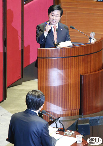 1일, 국회본회의장에서 국회 긴급현안 질의가 진행되고 있는 가운데, 민주당 박범계 의원이 황교안 법무부장관에게 질의하고 있다.