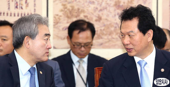 2일 오전, 제320회 정기국회 교육문화체육관광위원회 전체회의가 국회 교육문화관광체육위원회 회의실에 열린 가운데 서남수 교육부장관(사진 오른쪽)과 유진룡 문화체육관광부장관이 대화하고 있다.