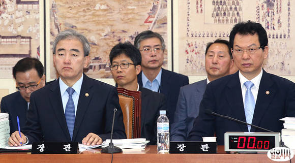 2일 오전, 제320회 정기국회 교육문화체육관광위원회 전체회의가 국회 교육문화관광체육위원회 회의실에 열린 가운데 서남수 교육부장관(사진 오른쪽)과 유진룡 문화체육관광부장관이 대화하고 있다.