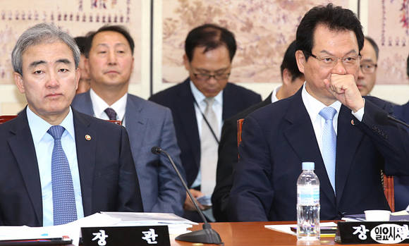 2일 오전, 제320회 정기국회 교육문화체육관광위원회 전체회의가 국회 교육문화관광체육위원회 회의실에 열린 가운데 서남수 교육부장관(사진 오른쪽)이 헛기침을 하고 있다.