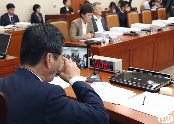현오석 부총리 겸 기획재정부 장관 등이 참석한 기획재정위 전체회의 도중 강길부 기재위원장이 목이 타는 듯 물을 마시고 있다.