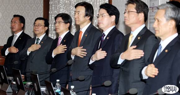 2일 오후 서울 세종로 정부서울청사에서 열린 국무회의에 참석한 국무위원들이 국기에 대한 경례를 하고 있다.