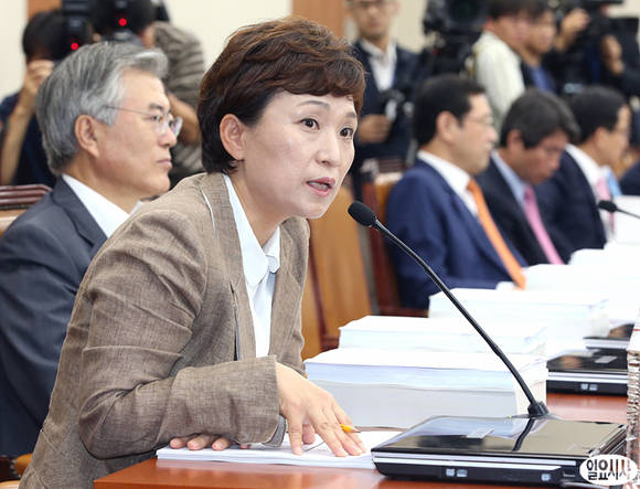 2일 국회에서 열린 기획재정위 전체회의에서 민주당 김현미 의원(기재위 야당 간사)가 지난 회의의 일방적 취소에 대해 강길부 기재위원장에게 항의하고 있다.