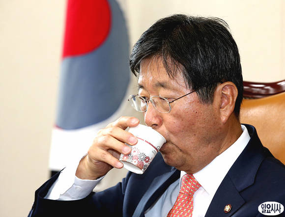 강길부 기재위원장이 2일 국회에서 열린 기획재정위 전체회의 도중 물을 들이키고 있다.