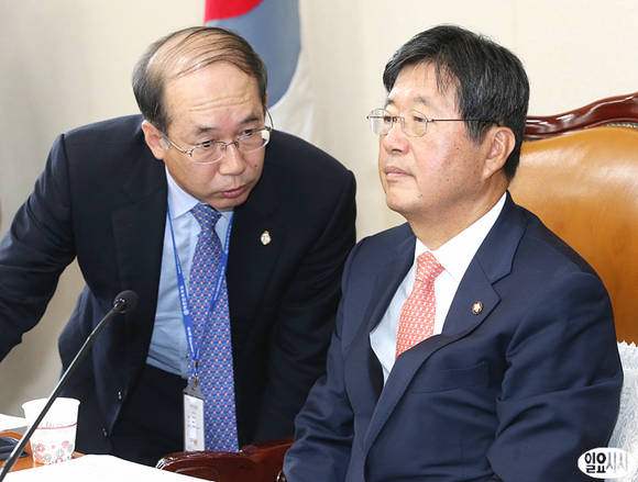 강길부 국회 기재위원장이 2일 국회에서 열린 기획재정위 전체회의 도중 관계자와 이야기를 나누고 있다.