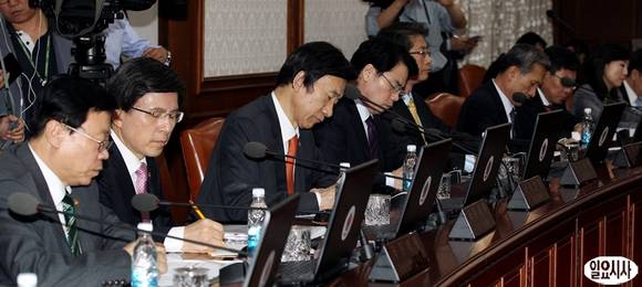 2일 오후 서울 세종로 정부서울청사에서 열린 국무회의에 참석한 국무위원들이 정홍원 총리의 모두발언을 경청하며 필기를 하고 있다.