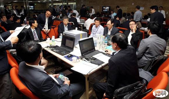 4일 오전 서울 여의도 국회에서 기획재정위원회 전체회의가 열리고 있는 가운데 관련 공무원들이 회의실 앞 로비에 대기하며 업무를 보고 있다.