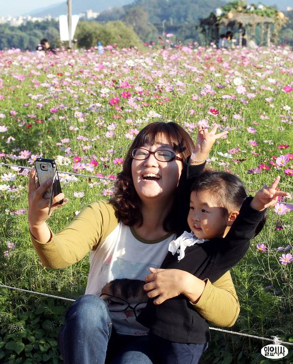 4일 경기도 구리한강시민공원에서 열린 '제13회 구리 코스모스 축제'를 찾은 시민들이 코스모스를 배경으로 사진 찍으며 가을 정취를 즐기고 있다.