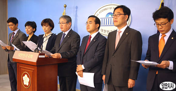 7일 오전, 국회 정론관에서 민주당 초선 의원들이 기자회견을 열어 손학규 상임고문의 재보선 경기 화성갑 출마를 촉구기자회견을 갖고 있다. 왼쪽부터 김광진, 남인순, 배재정, 김용익, 박홍근, 김기식, 진성준 의원