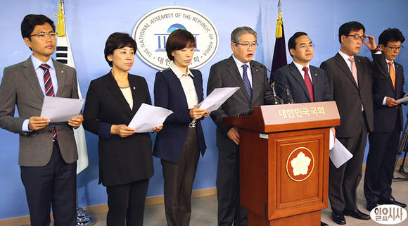 7일 오전, 국회 정론관에서 민주당 초선 의원들이 기자회견을 열어 손학규 상임고문의 재보선 경기 화성갑 출마를 촉구기자회견을 갖고 있다. 왼쪽부터 김광진, 남인순, 배재정, 김용익, 박홍근, 김기식, 진성준 의원